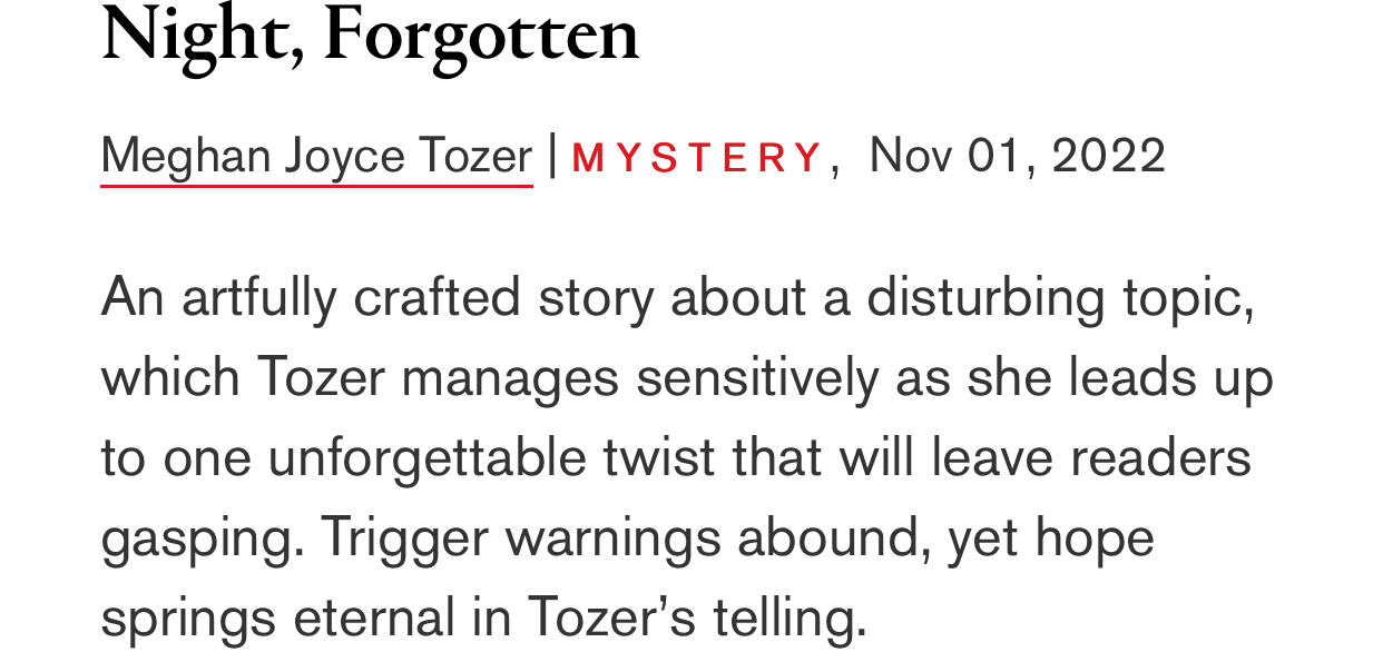 I offer free, 20-minute virtual chats with an optional Q&A to book clubs who have read my novel Night Forgotten. Use the form below to provide a bit of information about your group, and I'll send you an exclusive discussion guide including "behind-the-book" details, photos, and a playlist. In the meantime, check out the Discussion Questions at the back of the book.